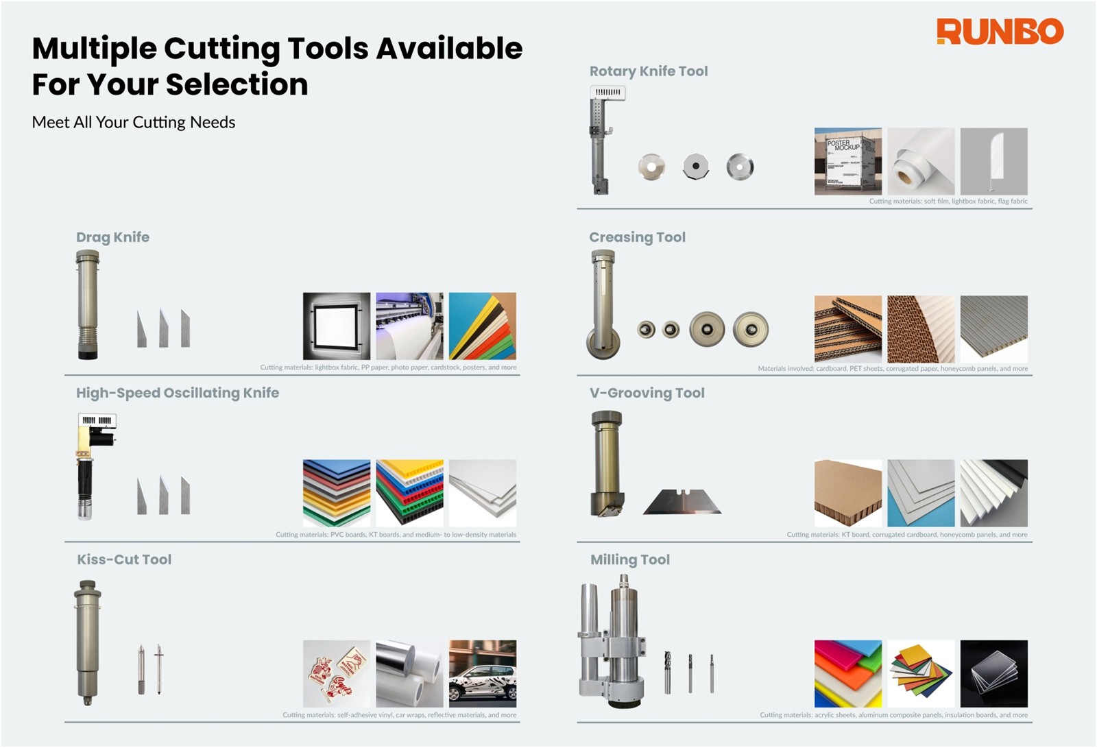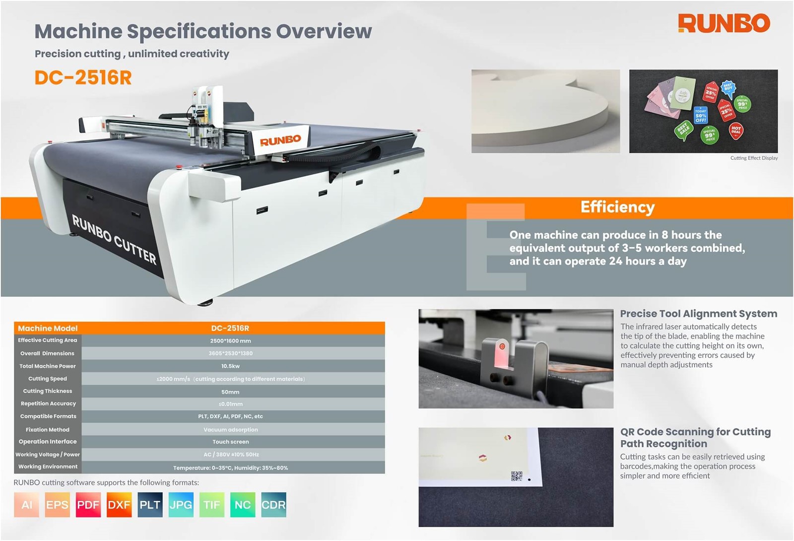 Tha RUNBO DC - 2516R air a dhealbhadh gu sònraichte airson gnìomhachas sanasachd is shoidhnichean, comasach air raon farsaing de stuthan a ghearradh gu h-èifeachdach leithid siotaichean acrylic, bùird PVC, bùird KT, bùird foam, canabhas, agus vinyl fèin-adhesive.